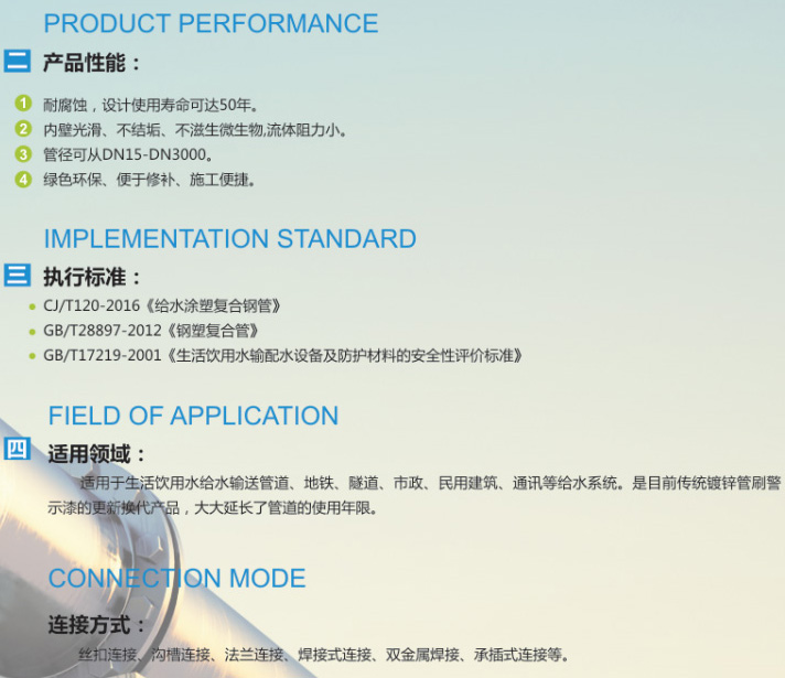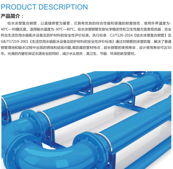給水涂塑復合鋼管,以直縫焊管為基管,它具有優良的綜合性能和很強的耐腐蝕性,使用外界溫度為-40℃-90攝氏度,適用輸水溫度為30℃-80℃.給水涂塑鋼管在耐化學穩定性和衛生性能方面表現優越,完全符合生活飲用水輸配水設備及防護材料的安全性評價標準。