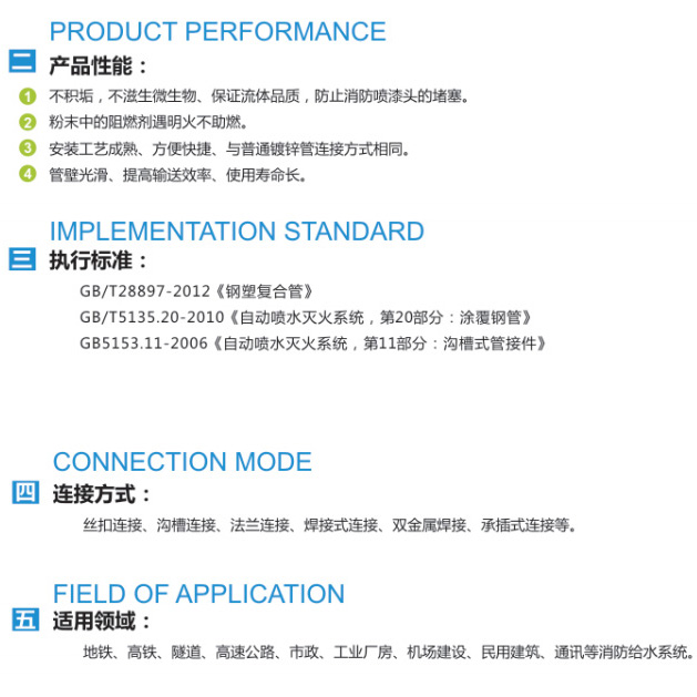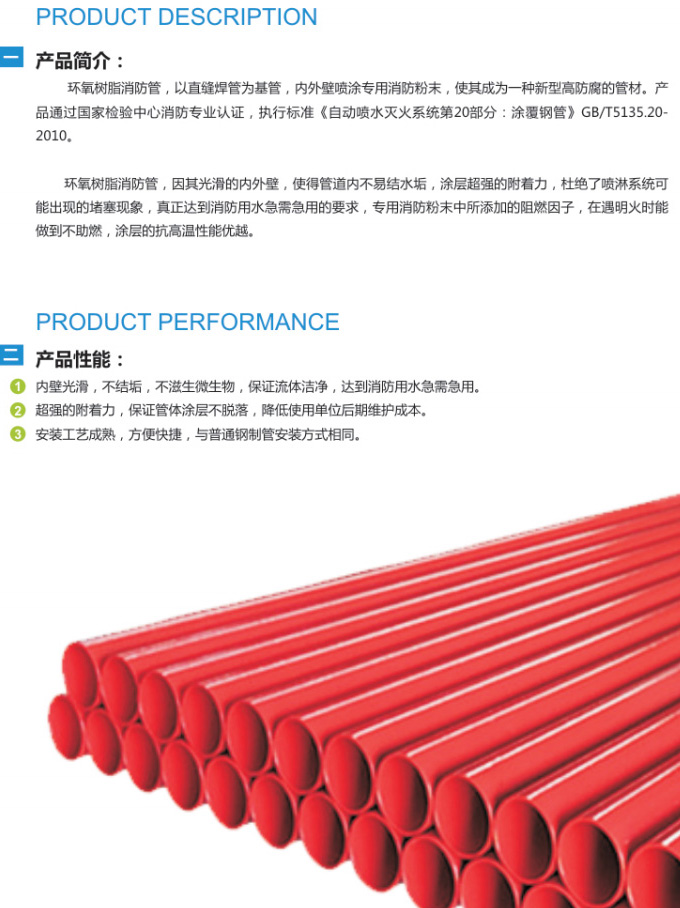 環(huán)氧樹脂消防管,以直縫焊管為基管,內(nèi)外壁噴涂專用消防粉末,使其成為一種新型高防腐的管材。產(chǎn) 品通過國家檢驗中心消防專業(yè)認(rèn)證,執(zhí)行標(biāo)準(zhǔn)