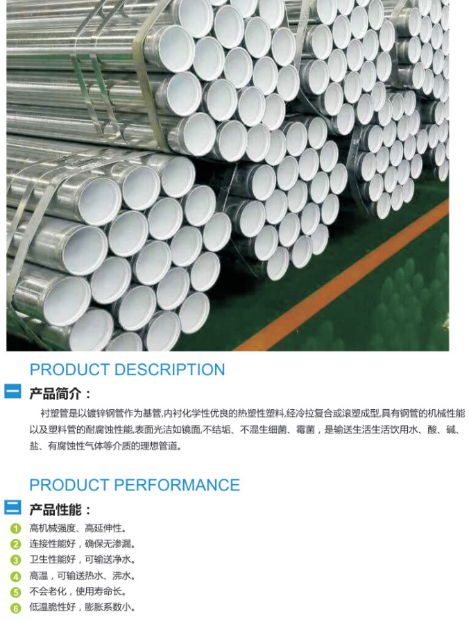 簡(jiǎn)介:襯塑管是以鍍鋅鋼管作為基管,內(nèi)襯化學(xué)性?xún)?yōu)良的熱塑性塑料,經(jīng)冷拉復(fù)合或滾望成型,具有鋼管的機(jī)械性能以及塑料管的耐腐蝕性能,表面光潔如鏡面,不結(jié)垢、不混生細(xì)菌、霉菌,是輸送生活生活飲用水、酸、堿、鹽、有腐性性氣體等介質(zhì)的理想管道